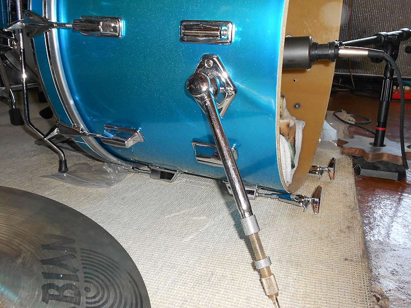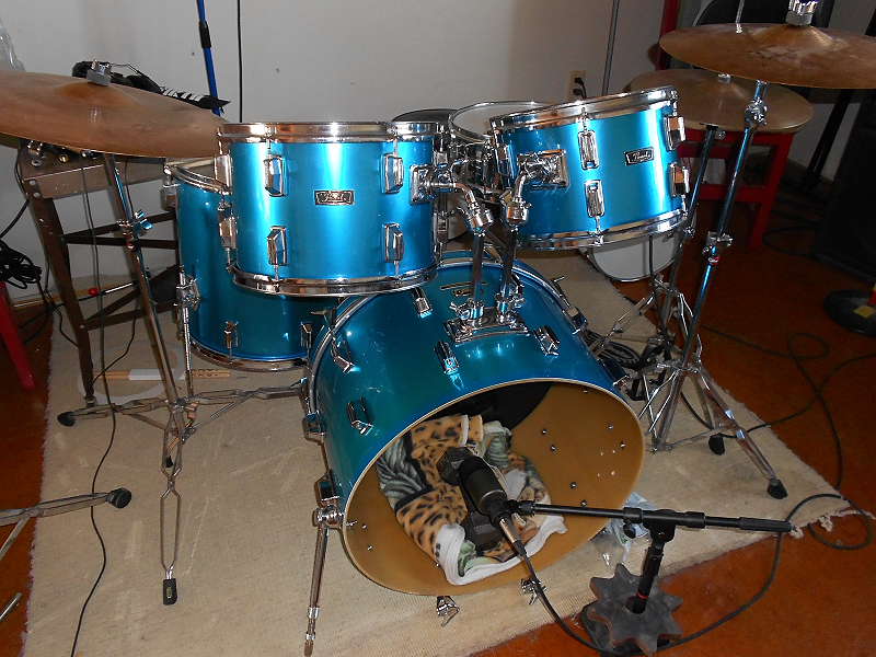Please excuse the mess in the photos. I was excited to replace the little mahogany bebop kit with the 18" bass. The 22" fiberglass is very low and immediate. No mellowing of mahogany, just a heavy, jack-boot kick to the gizzard. Mmmm!