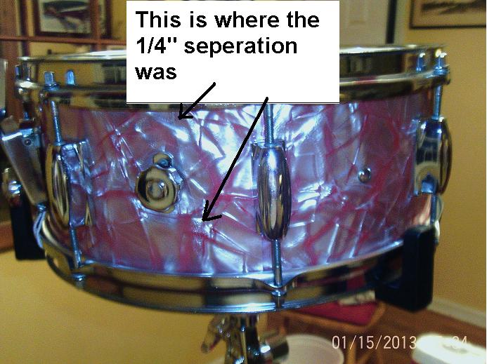 Removed the wrap, re-glued it and repaired the gap in the wrap. Cleaned everything, threw some new heads and a set of snare wires, cranked it up tight and it sounds SWEET!!! Hey Mike did Pearl make 6 and 8 lug snares? This ones an 8 lugger