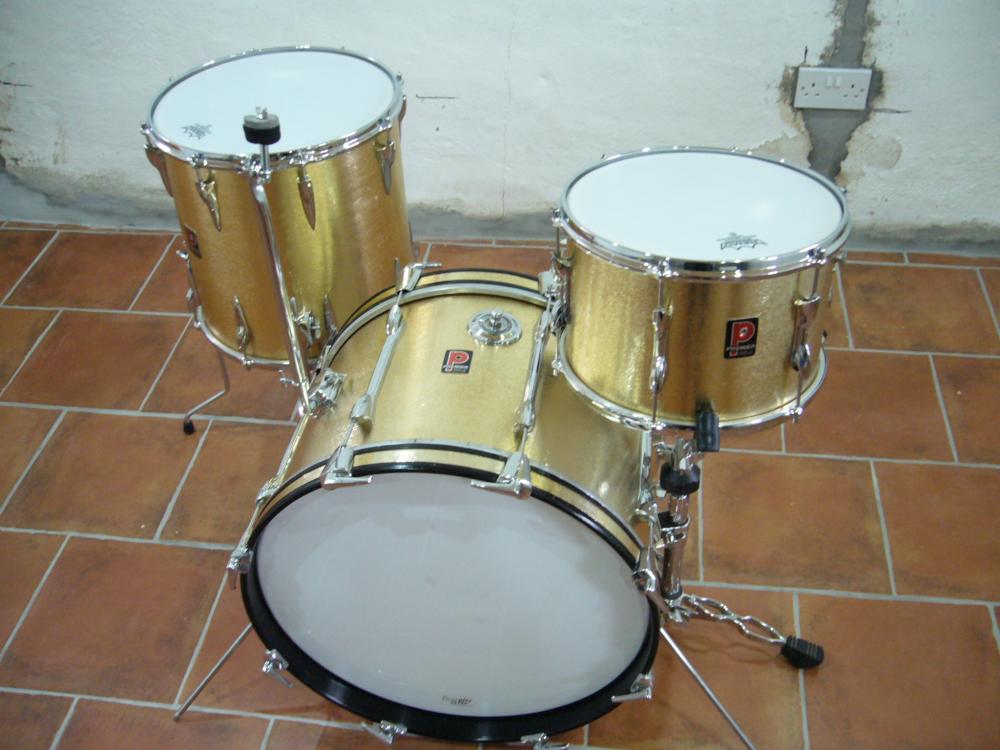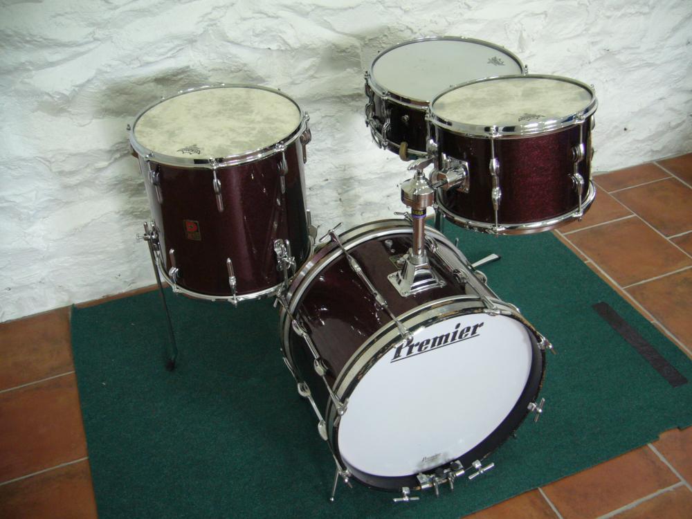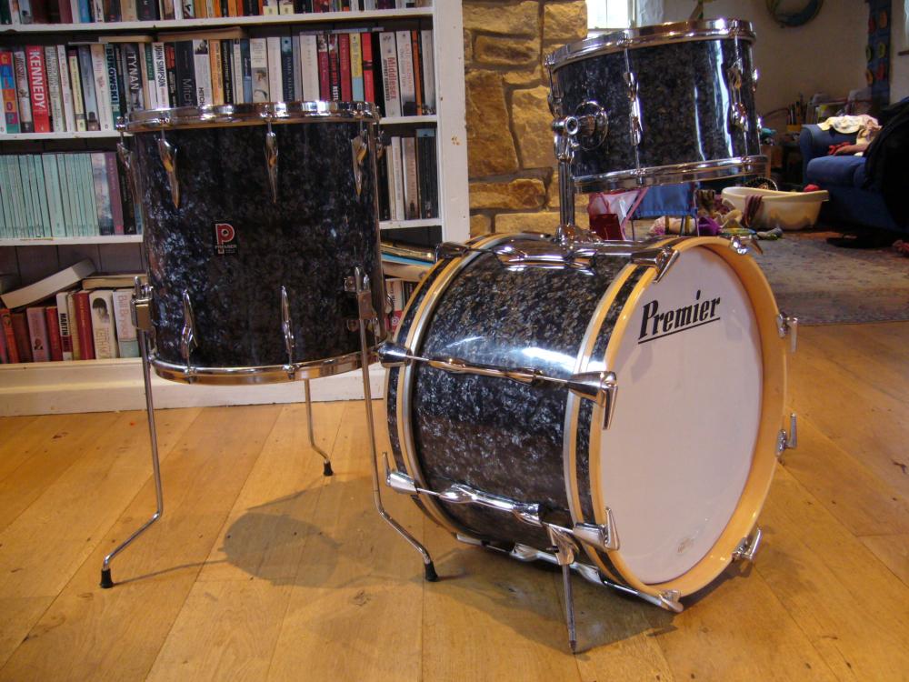 I see your set has hit an evolutionary cusp, you have what is commonly referred to as a "dagger" mount on the bass and 3point spigot plate to the 12, just like the BDP set below. The dagger mount supercedes the original "disappearing" style arm/mount as seen on the White Pearl below which in turn is replaced by what I like to refer to as the "eartrumpet". Quite possibly the single most useless piece of hardware ever produced by Premier in my opinion. Or maybe it is the other way around, can't quite remember!