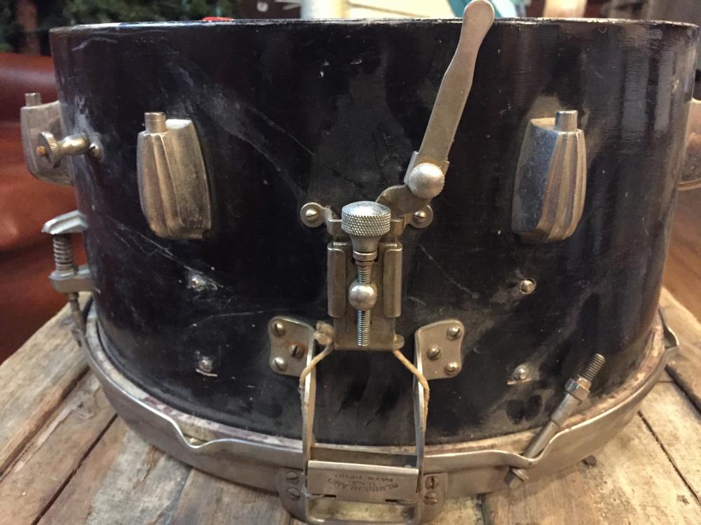 Story of this drum: I purchased this at auction and upon examination, found that it was brush painted in black with no original finish remaining, 9 of the 16 lugs were cracked, broken, or missing, and the top engraved hoop was missing (looking for one in nickel if anyone has a spare). When I removed the badge, I found remnants of very fragile silvery blue lacquer finish typical of their silver and blue Duco paint scheme. The flaking finish probably inspired the brushed on black paint.