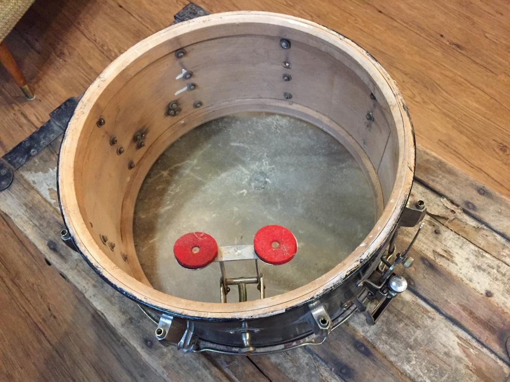 I'm restoring this Slingerland Radio King snare. I think it's from around '39/'40 but wanted to get your opinion on its manufacture year, exact model designation, and also see if someone has information on the correct sizes of washers used to secure the snare bridges to the shell.