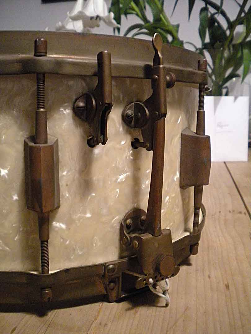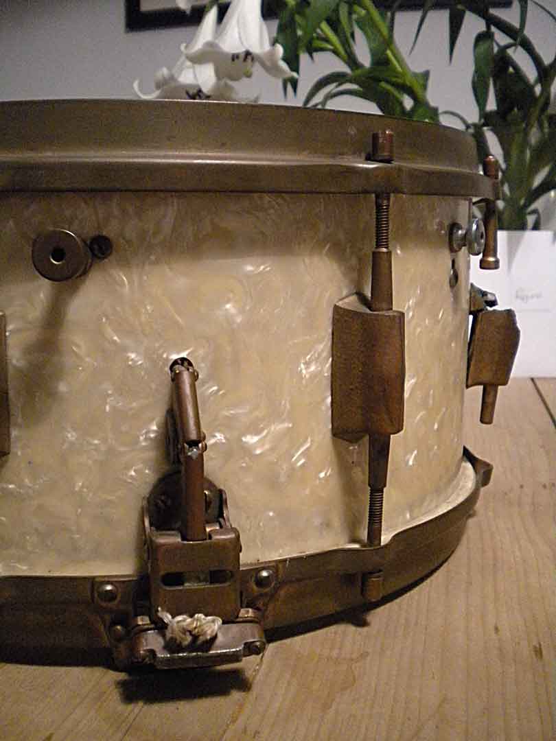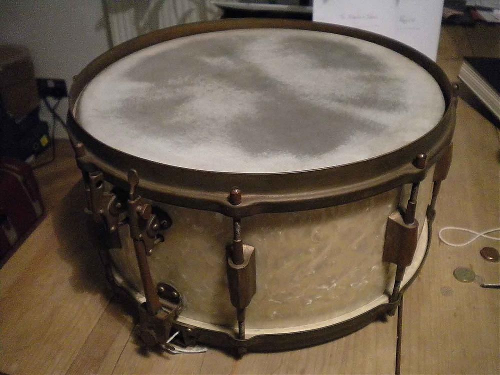 Hello out there - I've just got hold of a c.1930's Premier Dominion Super 14x6.5 snare (Pearlex wrap, Regal hardware finish - and it's stand!) which is looking and sounding great - but - as you can see in the first pic, one of the lugs has shattered. Other than this the drum is completely intact and ready to gig. I'm happy to replace all the lugs with an alternative if needs be, but do not have any intention of re-drilling the shell! ;) Any help and advice with this would be very much appreciated!
