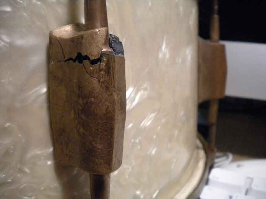 Hello again, and many thanks for your replies. Here's an update. Whilst I wait for Matt at Vintage & Classic Drums here in the UK to source a replacement, in the meantime I thought I'd have a shot at repairing the lug. It ended in complete failure, but was good to give it a go! After assembling what was left of the original lug, I used QuikSteel epoxy to re-build what was missing. I re-painted with Humbrol paints (Antique Bronze, with a coat of Gold on top to get the aged look). You can tell from the pics how much the lug had 'fatigued' anyway, so I went for a slightly bumpy finish - not so easy to achieve as a smooth finish, to be honest! It looked great, but once I started cranking it up..... ;) I'll be patient and await Matt's search to bear fruit!
