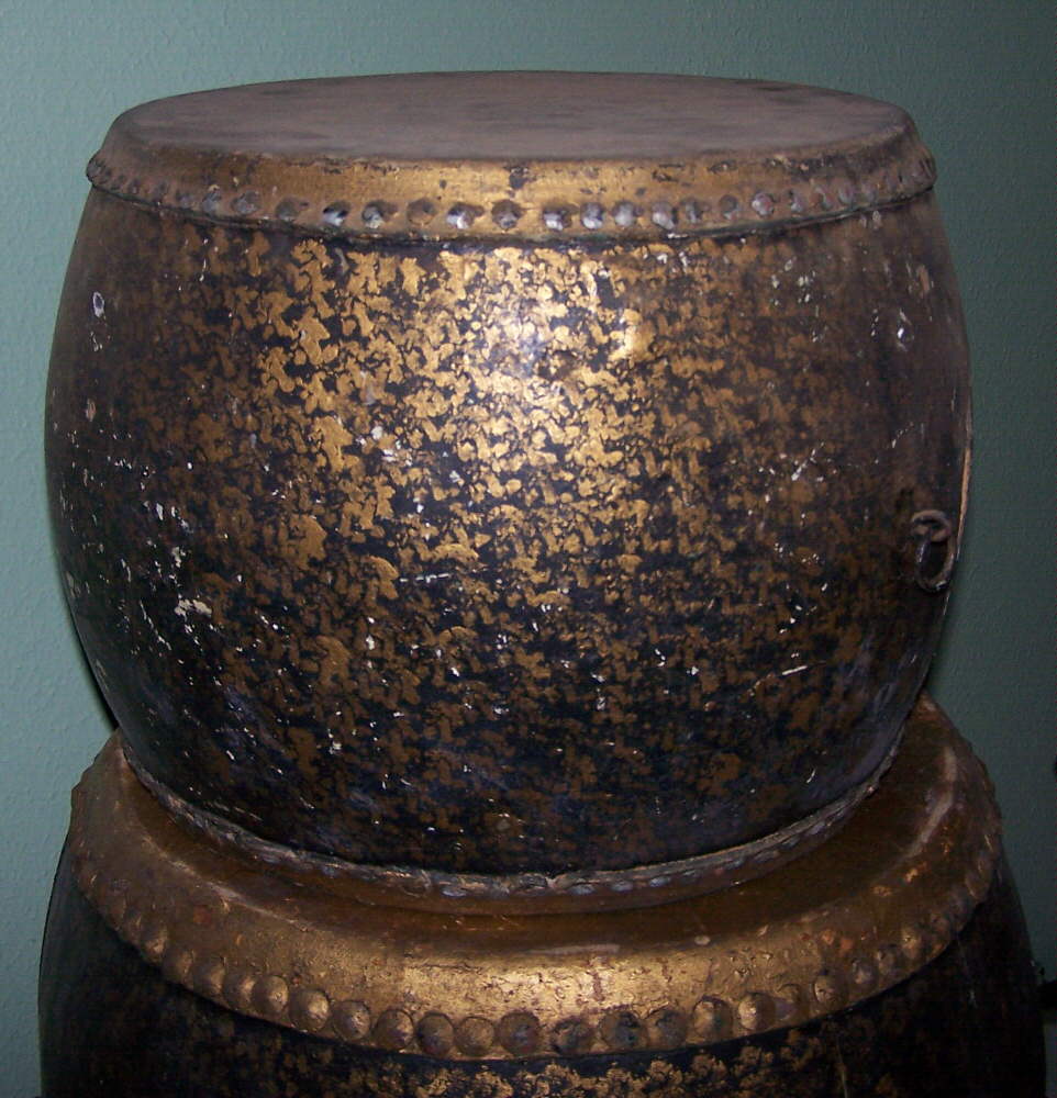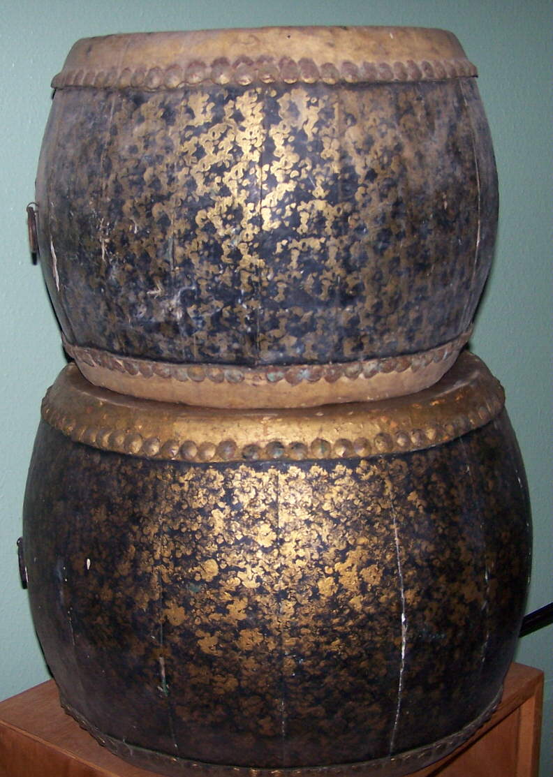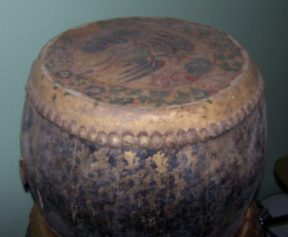 I acquired these drums from my grandfathers estate and have not learning much about them. These appear to be Chinese in origin with thick heads (maybe pig skin). The paint matches a large Ludwig bass drum but they could have been repainted to match. you gentlemen are the experts, please tell me what you know about them. They look great in my drum cave but I have yet to clean them until I know their value as collectable or just fabulous drum art. And by the way they still sound good. Thanks in advance.