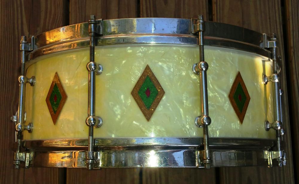 Beautiful and rare Slingerland Artist model from the early '30s in white marine pearl with Full Dress sparkle diamonds.
