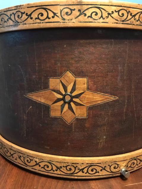 Here's a few screen shots of the Ludwig catalogs from the '20's...One of the pages (Ludwig_1927_b) has the statement "Send for prices on ornamental finishes." Not sure if that means fancy inlays as in your example or some appliqués that adorned some drums (i.e. a sticker from the organization you were drumming/participating with) and are clearly featured in later catalogs.