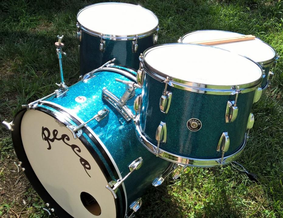 Also included will be this kit's bass drum pedal (which I did not restore), a 15" crash cymbal, ALL of the original drum heads (unless you don't want them-it won't effect the price) as well as the NEW Remo Ambassador bass drum head that I created with the Recco name on it. The snare stand is NOT included. All other "new" drum heads are NOT included.