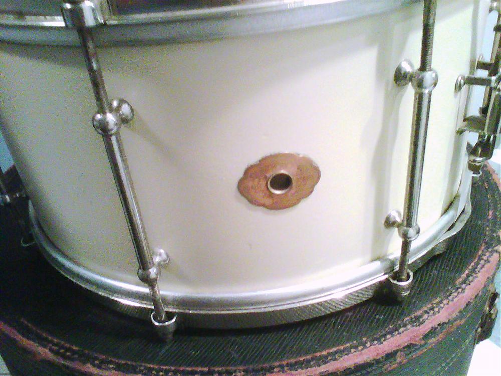 Hello, I have a Slingerland (1920's I was told) 1 ply snare with 8 tube lugs. I'm thinking that the finish is not original. It's kind of ivory white, and honestly, I don't think it's the original finish, for some reason it just doesn't seem right. I've quite good experience with painting, masking and such, and I can see paint on the edges of the badge that lead me to believe the finish was altered.