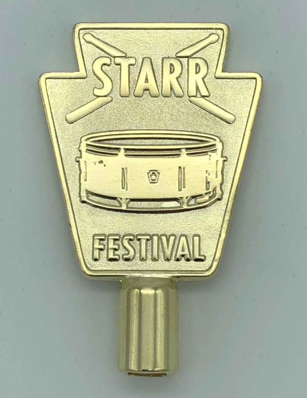 Backstory: The drum key logo was created in part by Ringo himself. The front depicts the Starr Festival name and an image of the snare drum itself. The back shows the year (1963) of Ringo's original Ludwig Jazz Festival snare drum, which has a manufacturers ink stamp date of April 18. Assembly of the 15 Starr Festival snare drums began on April 18, 2018, 55 years to the day to match Ringo's. A minimum number of drum keys had to be produced though only 15 were needed. It was decided to make the remainder available to Beatle and Ringo fans that wanted to have a tie-in to the Starr Festival snare drum project.