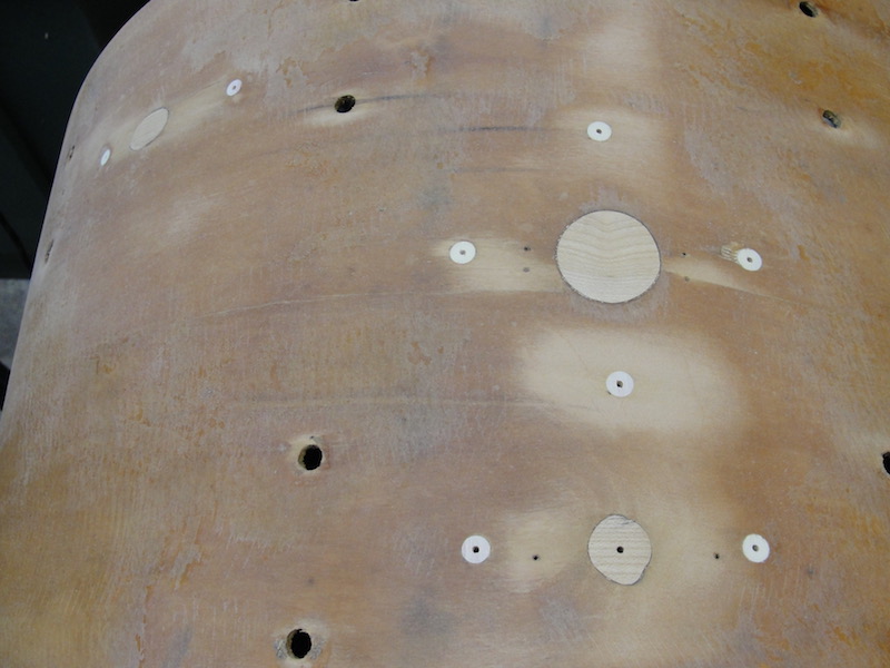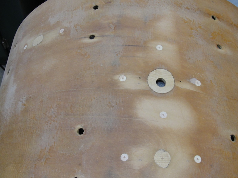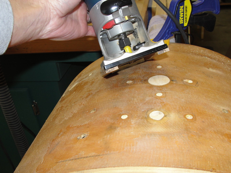 In order to level the plugs with the drum surface, I attached a few skids to my trim router with double-faced tape. This allowed me to extend a 3/8" straight cutting bit slightly below the router base. I could bring the plugs nearly level to the drum surface with this set-up. Then I gently sanded with 150 grit paper in my random orbit palm sander. You can see the results of this in the second photo. Afterwards, I filled the small holes with wood filler, and drilled a 7/16" hole for the badge. The third photo appears to show the tiny holes still there, but they are actually filled with darker wood putty.