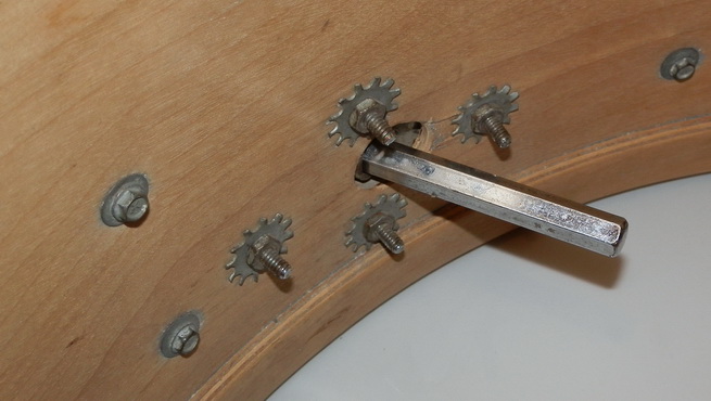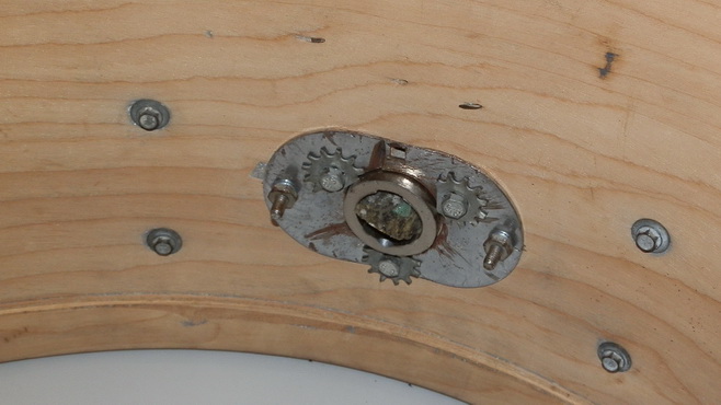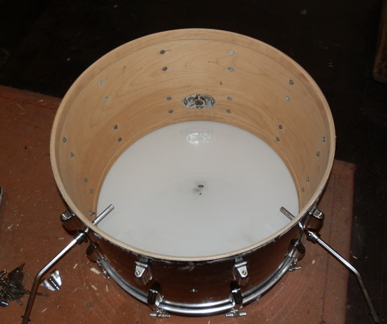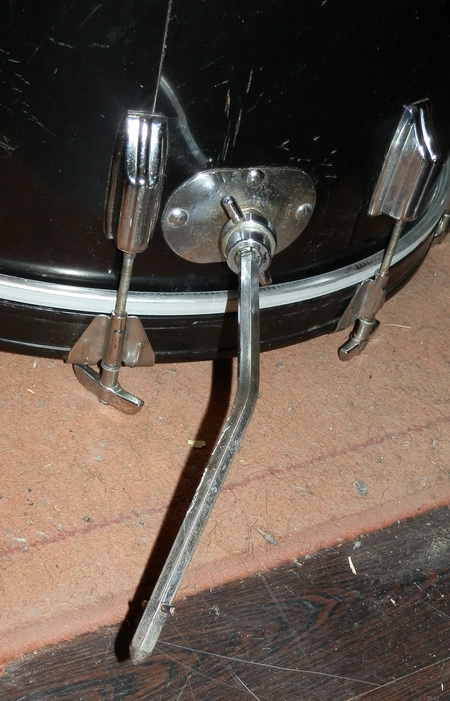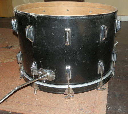 I came across this bass drum yesterday,and take a couple of pictures to share with you,and I was really sad about modification that some of the previous owner(s) cone it.Someone send entire shell from inside,probably due to nesting drums in bass drum to gig and from gig,and gray interior is gone,nut I must say,the job is well done,surface is smooth.The lugs,claws and t-rods look original,bass drum spurs don't,and there has been modification od tom holder bracket with some 90-ies Amati tom bracket.I must say,that I never before had opportunity for closer look at Rogers bass drum,so i don't have idea about authenticity of bd hoops,but looks to me that space for inlays is wider than on some other hoops.Is that original or not?I forget to take pic of badge,but you can see spikes from that script Rogers logo above tom bracket.And yess,price is $140