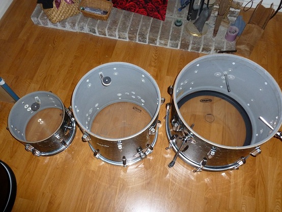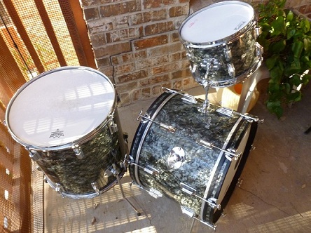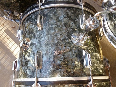 OK, I'll swallow my pride and try one more time to sell a great kit. This is a Rogers Cleveland era kit in a beautiful black diamond pearl finish. Everything is original except for cymbal arm. All tags are present and say Holiday, Cleaveland, Ohio. I was told the kit was made in 1965. This kit is easily a 9 out of 10, it has an 8x12,16x16,14x20, thanks,