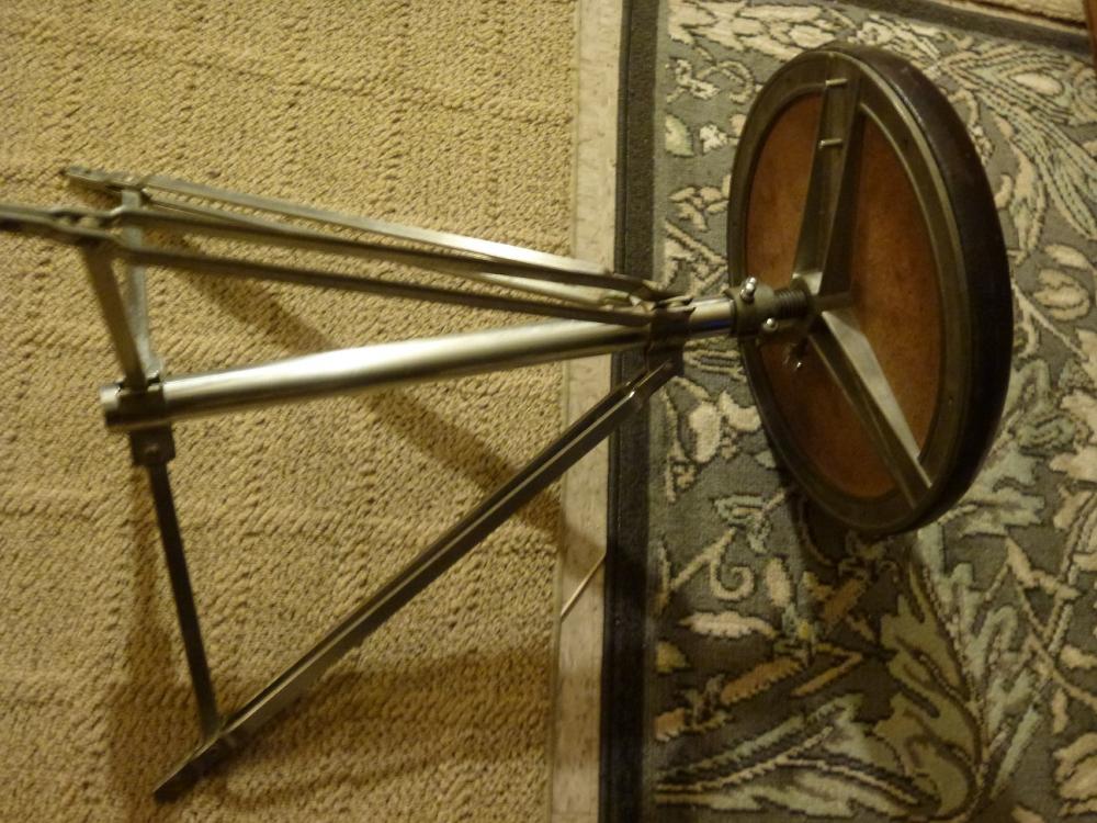 The throne is in good condition. The chrome will clean up nicely. The leather seat is in good condition with only a few small tears. I believe it needs new foam as it quickly deflates and you end up sitting on the wood base. It should be easy to replace. No rubber feet. $30 plus shipping.