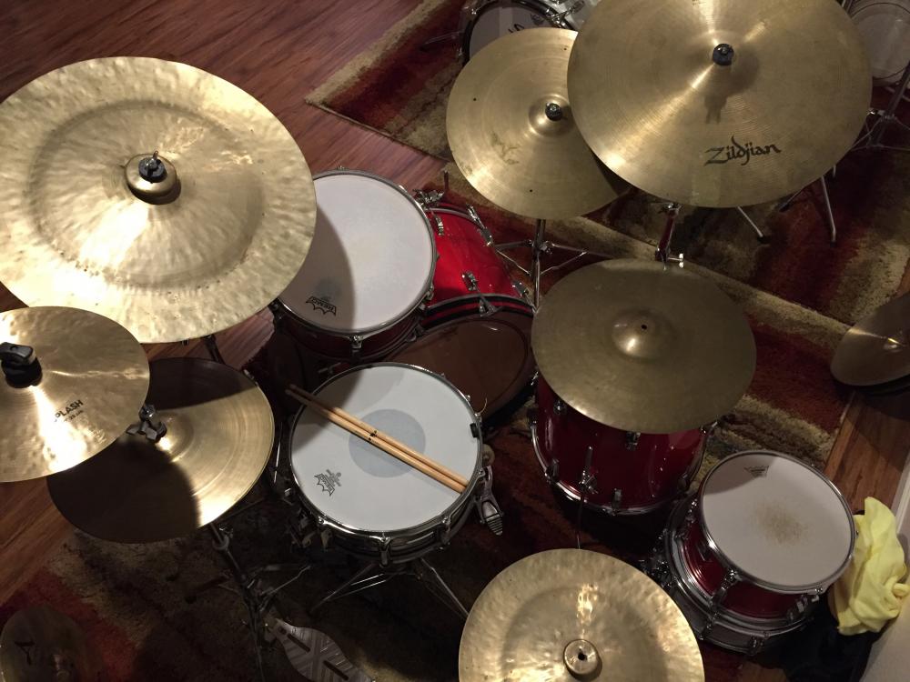 in pretty rough shape). More cymbals! All Zildjian: 22”ping ride, 18” crash, 17” sizzle, 13” high hats, 14” crash, then two small cymbals with cracks. Also, a 16” and 18” China (no name). Plenty of crummy hardware. The tom mount has been changed to pdp.