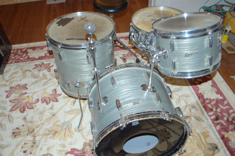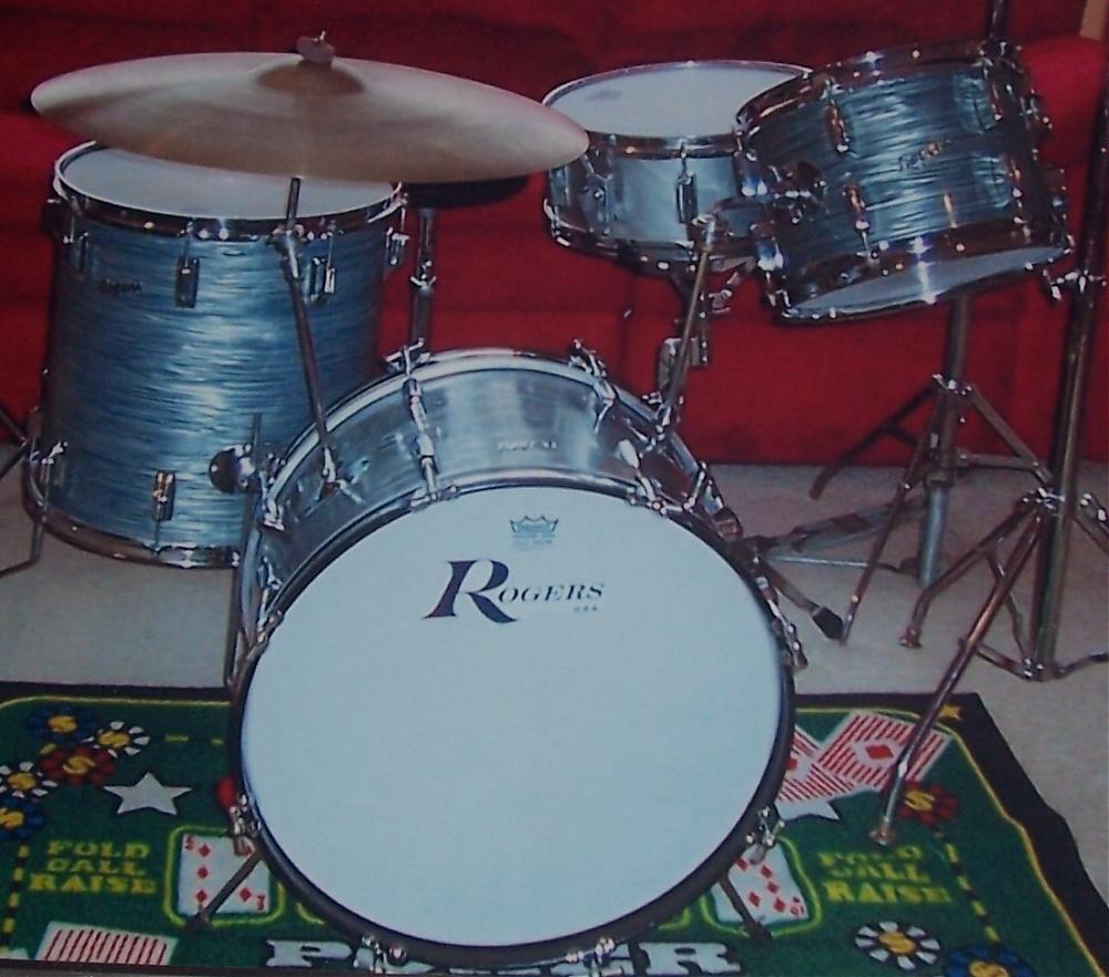 I just bought a Rogers kit 20/12/16 in steel gray ripple? with a BnB Dynasonic. Any ideas on the age and what model it is? I bought it off the original owner who believes he purchased in early 63'. All Cleveland and the serials are 18608,18630 and 18619-the Dyna is #1922 and a seven liner. The kit still has the original heads(except the front BD head) and there's no cracks to the BnB's. I took them off for pics the first time since they left the store! The only problem is some of the inlay on the hoops is missing. They haven't been cleaned since originally bought but they should be glowing with a little TLC.