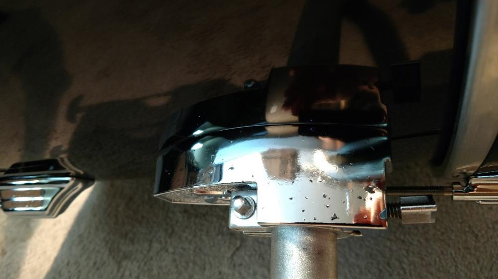 Brand new Remo Fiberskyn 2 Medium Heads (no longer made). Each head comes with a removable felt strip for muffling. There is some pitting on the lugs and spur mounts. Most of the lugs are good; the ones with the more noticeable pitting I placed on the bottom of the drum, but still nothing major. See photo below for the spur mount with the worst pitting of the two. Wood hoops have been re-painted and re-lacquered and look great and have the original inlay. Slight warping of batter hoop where the pedal connected. I moved it to the 9 o' clock position so it would be out of the way for the pedal now (See photo below). There is slight lifting of one of the seams of the wrap, but nothing major (the other seam is fine). The seam that has the slight lift is at around 3 o' clock when viewed from the batter side (opposite the badge). Overall wrap is good, with some scuffs and dings. A few of the T-Rods are slightly bent, but again still usable and nothing major. A few of the claws have some minor pitting and a tad bit of rust, but is only noticeable upon very close inspection.