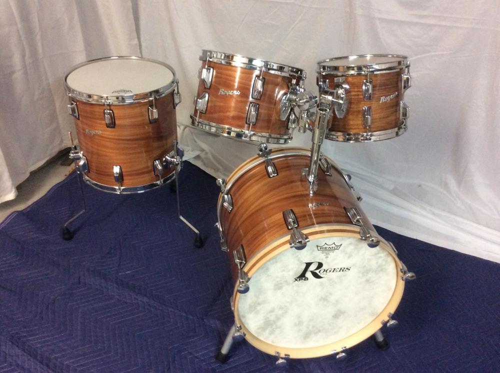 Cracked wrap. Painted exterior. Double Painted interior! Wrap removed, paint removed. Then - OMG - extra holes drilled for bottom lugs. New Koa Wood veneer applied. Bearing edges cut (bottom one fully, top one touched up). Still gonna put on a pair of matching script badges to match the rest of the set - just because I like them more than the foil badges. New top rim from David Drewniak.