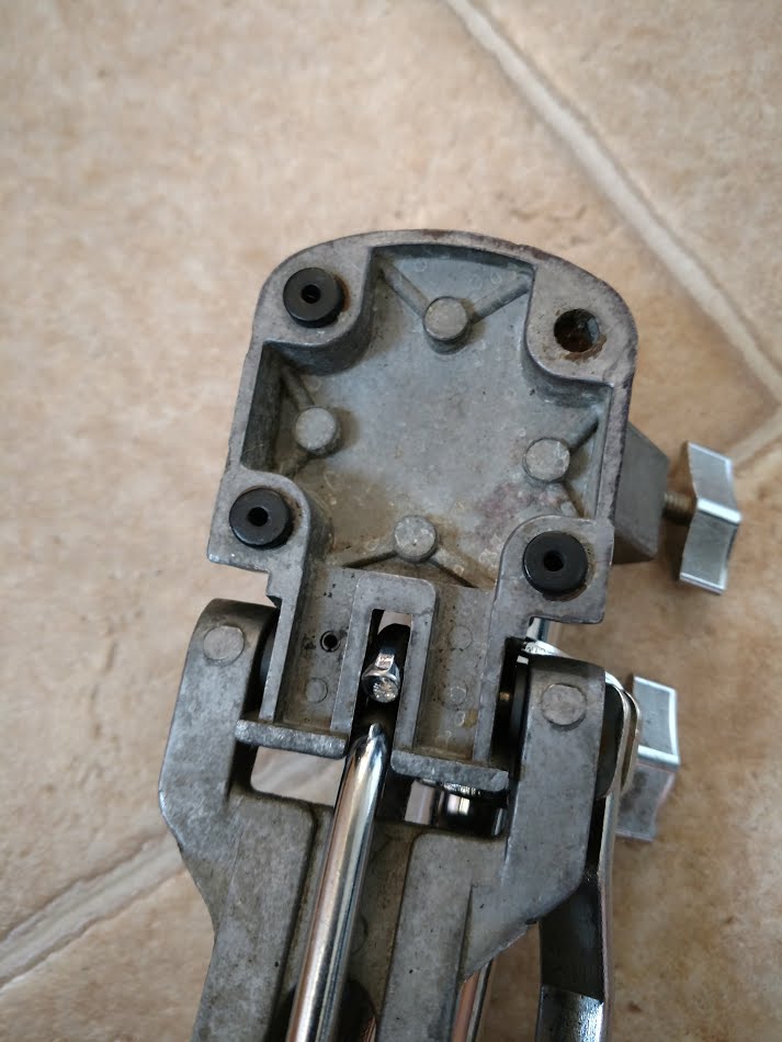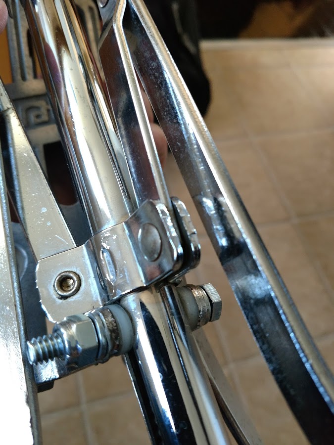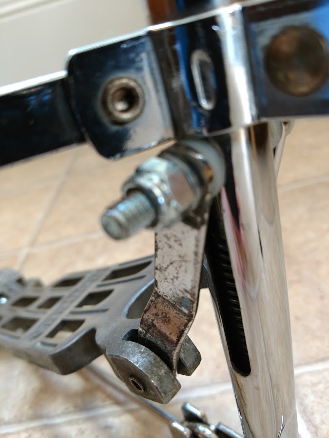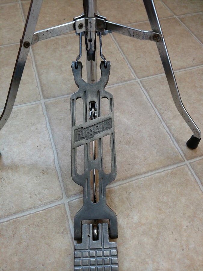 I am not a Rogers expert, but I believe that the hex head screw that connects the two metal pieces on the top of either side of the foot board (that connect the foot board to the lower pull rod) is not original (See the two Photos in the reply below). It works fine and everything functions as it should. It was like this when I acquired it, and I've never had another one before, so I cannot be 100% sure if the screw is original or not. There are nylon washers between the metal "pedal connector" and where it attaches to the lower pull rod. It's quiet and no metal to metal contact is happening. Otherwise, really nice shape. Has the original clutch (the t-screw on the clutch has they stylized "R"). The clutch may have some non-original nuts/washers (again, never owned one so not 100% sure) but the actual clutch and T-screw are original. Close up clutch pics in the reply below.