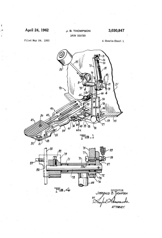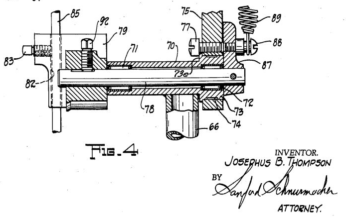 I found the complete patent description, as written up by Joe Thompson, and found the reference to mystery screw #77. Here's the answer:“Lateral movement of the tilt arm 75 is prevented by a flat-headed retaining screw 77, which bears slidably against the edge 73e of the collar 73.”I'm guessing this proved to be a non-issue and was soon dropped. What do you think?-Mark
