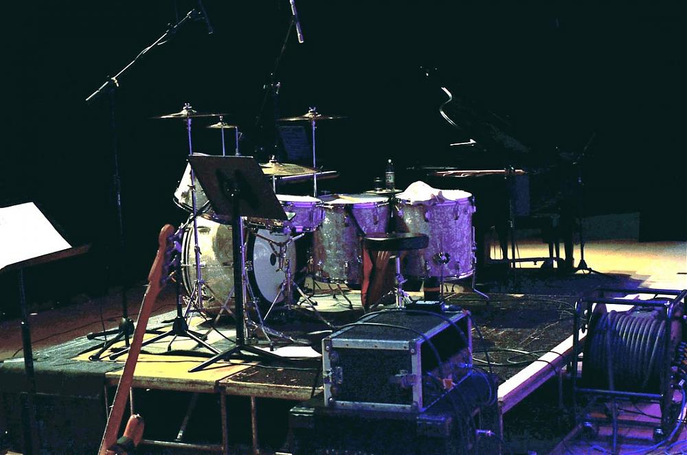 Being the BR freak I am, you might think that I play the 1 piece versions of the Swivo BD pedal and HH stand, but no... I prefer the hinged heel plate versions, and those are what I play. However!... I have in my collection a mid 60's Swiv-o-Matic BD pedal in the one piece footboard configuration as that is the style that BR played/preferred! Rogers cataloged the Buddy Rich Celebrity set WITH the single piece footboard on both too, just as BR played 'em. Here's a shot of my Rogers BR Celebrity's from one of the FS shows I played, and you can see the hinged footboards!