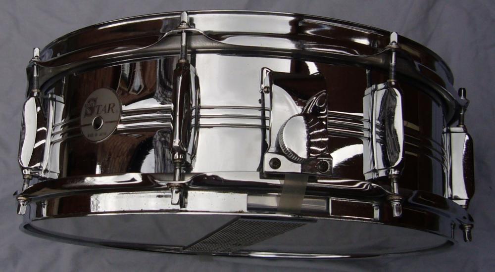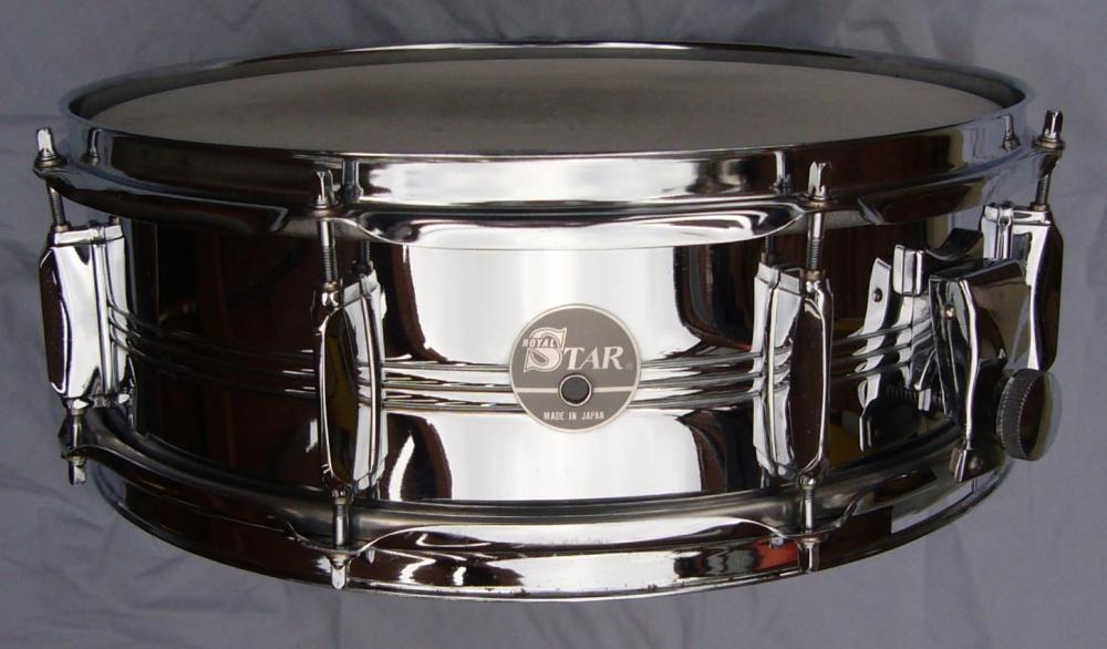 Here is one of my snare drums which i bought recently with a Royal Star pre tama drum kit chrome steel covered. I only have the snare pics as the kit is still being restored. The snare is chrome over steel round royal star badge, eight lugs and a very stylish strainer and butt. It has a great sound, has cleaned up pretty well, could do with new drum heads.......sean