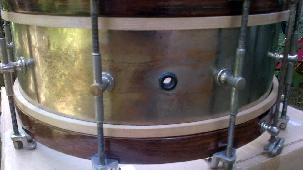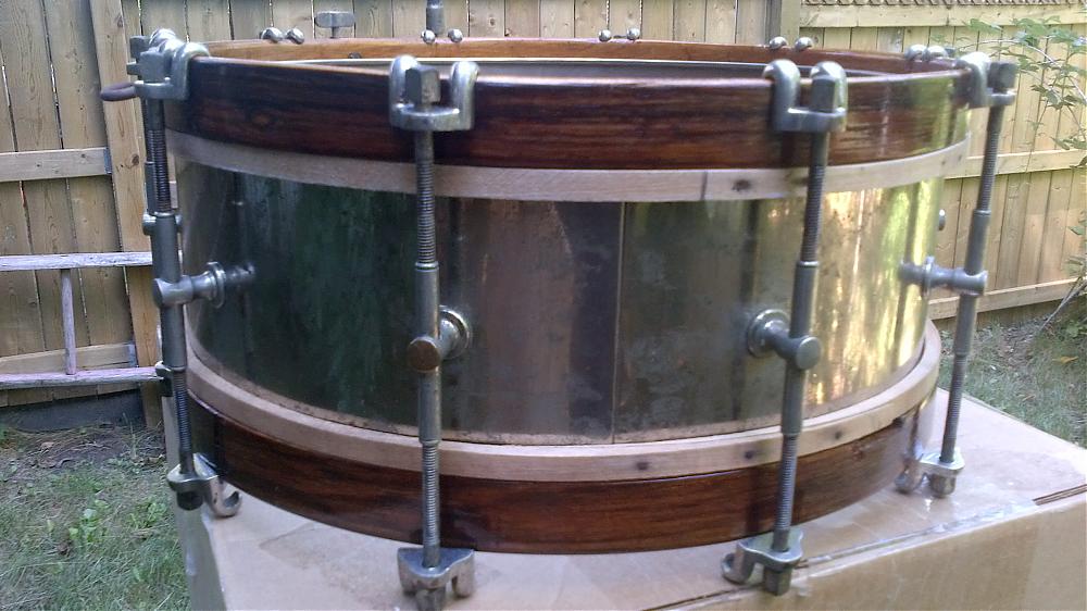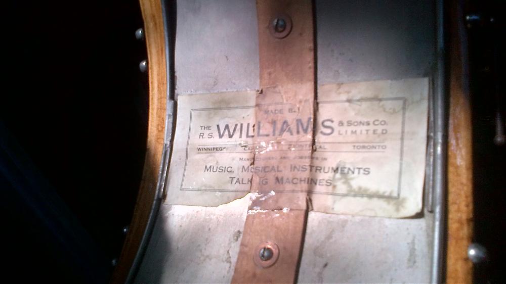 This 15 x 6 snaredrum was hanging from the rafters of a junkshop in Toronto. That's where it was likely made, around 1920, although Williams was a jobber as well as a manufacturer. I at first thought the shell was nickel on brass but I now think it is tin on brass. The hoops are maple,with what appears to be Rosewood veneer on the facing side The snare control is by a simple threaded rod and the original wirewound cloth snares(12) are in perfect shape.