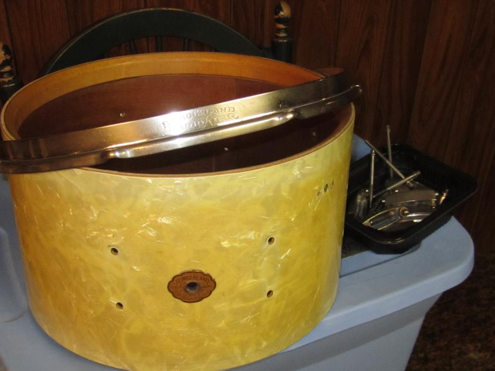 What do you guys think about this? I was tipped off to a school that is being torn down and the music department there did a cleaning out, well, more like throwing out of “old” drum gear. Isn’t this an amazing save? Looking for insight, where to find the snare side hoop, and strainer throw-off and butt plate. Not shown in the pic are the original red felt tone control and the missing quarter-sized piece of wrap. Also, you might not be able to see it, but the rim has the Slingerland engraving twice, about 2 lugs apart.