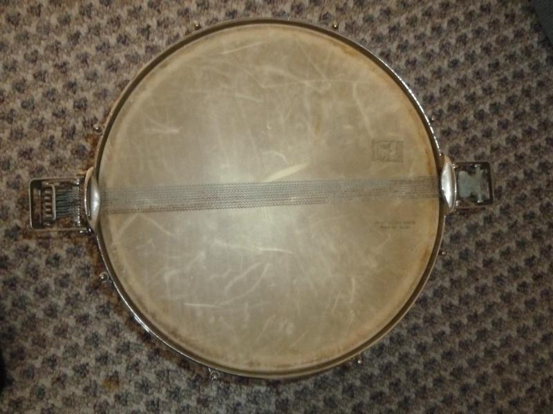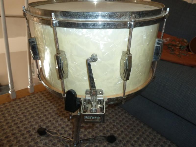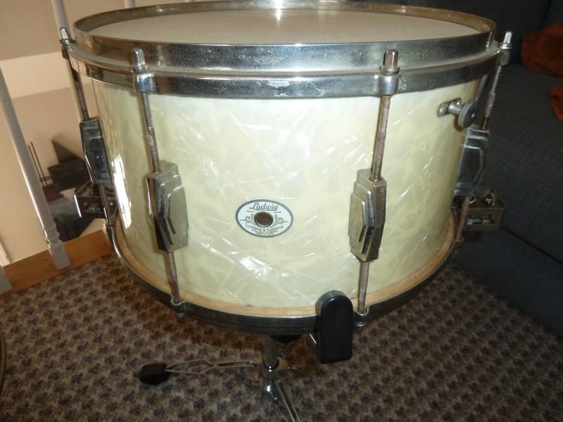 Selling a 1941 "Super Ludwig" snare drum in excellent condition. Snare side head is the original calfskin head in perfect shape. Playing head has been replaced with an Aquarian head. This is the rare 8" version of this snare drum. White Marine Pearl. The wrap is flawless. I left the metal unpolished but it is in great shape. $500. plus cost of shipping from Maine.