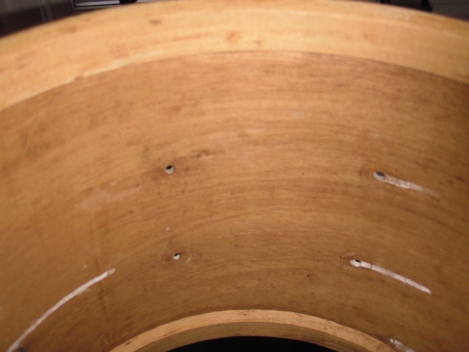 Shells are thin, 3 ply either birch or african mahogany with reinforcement rings in beech - it is easy to tell whether the shells are birch, which is lighter in colour than the beech rings, or mahogany, which is darker than the rings.