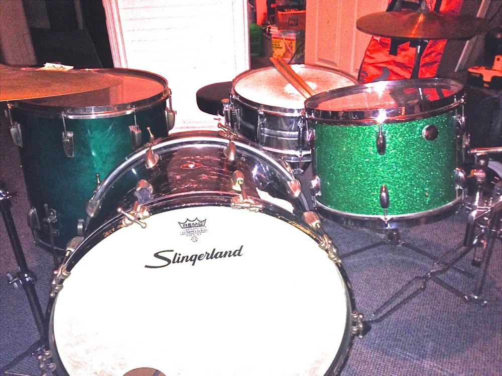 Sometimes you gotta do what you gotta do...Here is a kit with a 24" 60's Slingerland in BDP teamed up with a 13" green sparkle round badge tom along with a WFL floortom that had been stripped and stained by the previous owner...The snare is unknown but might be an old Pearl. Let's see yours.