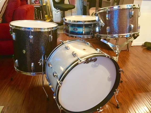 12x17 Ludwig gold sparkle Transition badge tenor tom for a bass drum. 12x15 Ludwig mid 60's tri colored tenor tom as floor tom. Early 40's Ludwig green sparkle 9x13 ride tom. '69 6.5x14 red sparkle Symphonic snare when i want a "matching snare". Trans badge Super for a metal snare. One of my favorite kits.Mike