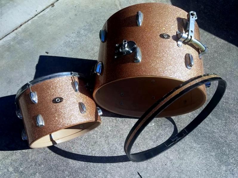 Late-ish 60's Slingerlands, chocolate milk coating inside, s/n's sort of line up with the 66-67 range based on the chart we have here, but I know that can be an iffy thing sometimes. Has some Rogers and Ludwig bonus extras on the 20", and it needs another hoop. Chrome needs a good cleaning and a trip to the buffing wheel all the way around. The 13" needs another hoop. The wrap looks pretty good for its age, no fading that I can see on first inspection. Should be fun getting it all back into shape, finding it's floor tom sister out there somewhere!