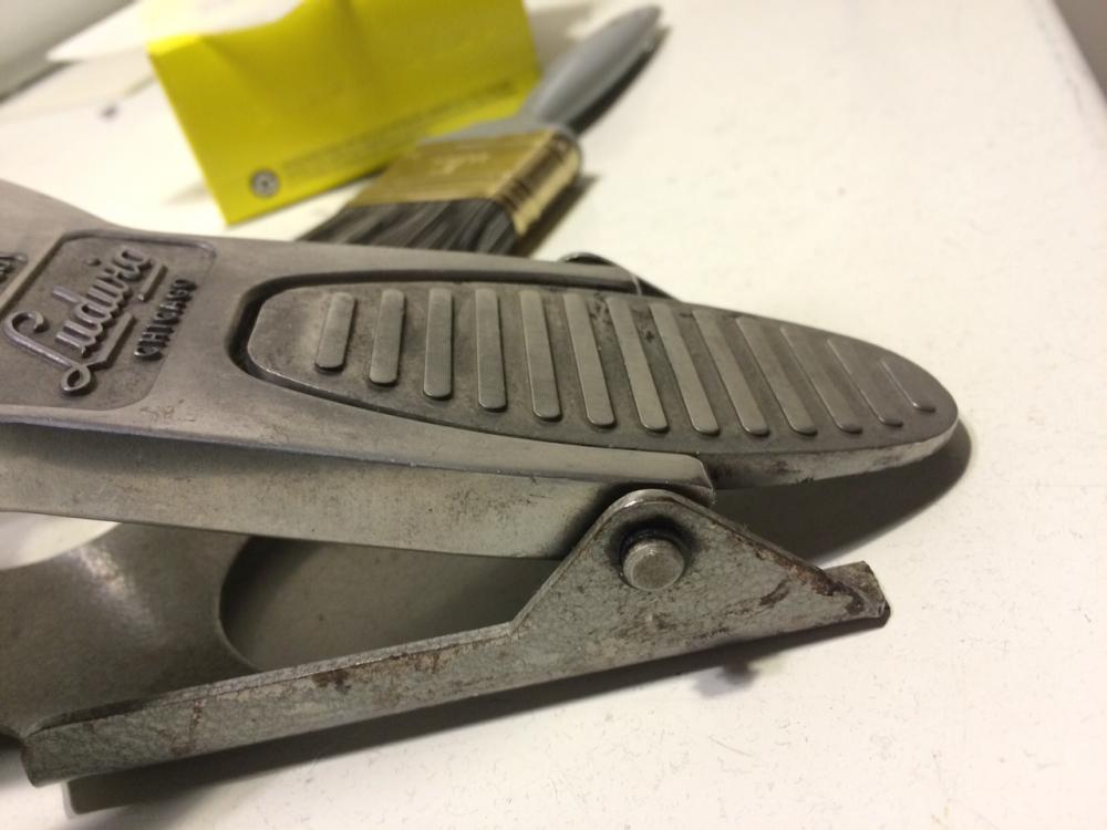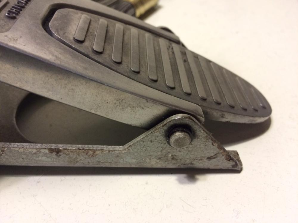 Mitch I have a SK that Bill F rebuilt. My friend now owns it but he's storing his gear here for a few months. Bill's fix was to install a long screw with a nylock nut on the end so she stays put. Nylock nuts are the nuts that have a nylon insert to prevent it from walking off the screw. My WFL SK pedal is here in a box somewhere. I'll dig it out and check it but think it's just a peened over pin like the one burgundy posted. Also C clips can be squeezed with pliers if they are a tad large. this will get you by until the correct one can be sourced. Good luck!