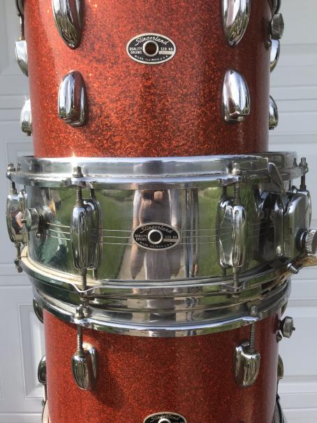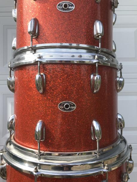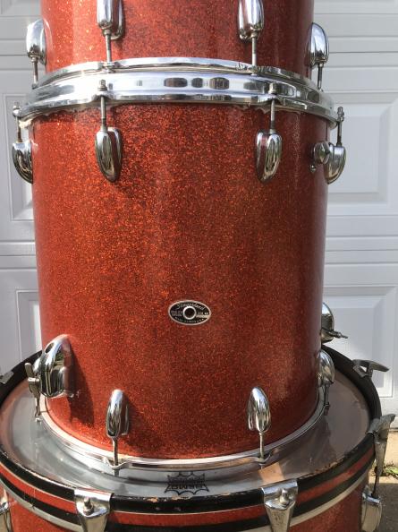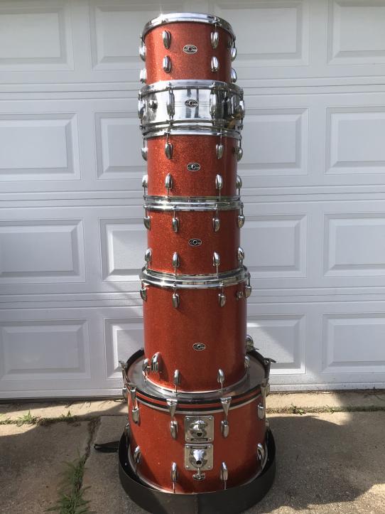 I just picked up this Slingerland Avante kit in the rare sparkling orange pearl of tangerine sparkle as. Seems to be an incredibly rare finish and I can only find a handful of pictures none of them being an Avante. The sizes are 22x14, 16x16 14x10, 13x9, 12x8 and 14x5 snare. This kit is pretty darn close to immaculate. No extra holes, no compromises to the wrap in any way, and 0 fading. The gentleman I purchased these drums from has had them in cases for the better part of the last 35 years. I’m missing 1 12 inch reso hoop and both mounts and a few bass t-rods. I should have all of those pieces original in the next week or so with some help from some of the amazing group members on various sites. I may be open to selling them after I get them complete and original. It sounds like there may be a few people on here hunting for this specific finish. Feel free to reach out to me on here or via email [email]dw91290@yahoo.com[/email] I’ll include a link to pictures a nono but I’m unable to figure out how to resize on mobile. If someone could help me with that it would be much appreciated. Thanks