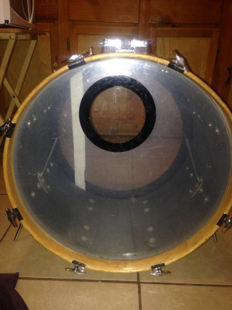 It's a 14x20, it has the Pearl type mount with Slingerland on it and the owner says it has re-rings and the interior has a dark texture, thanks.