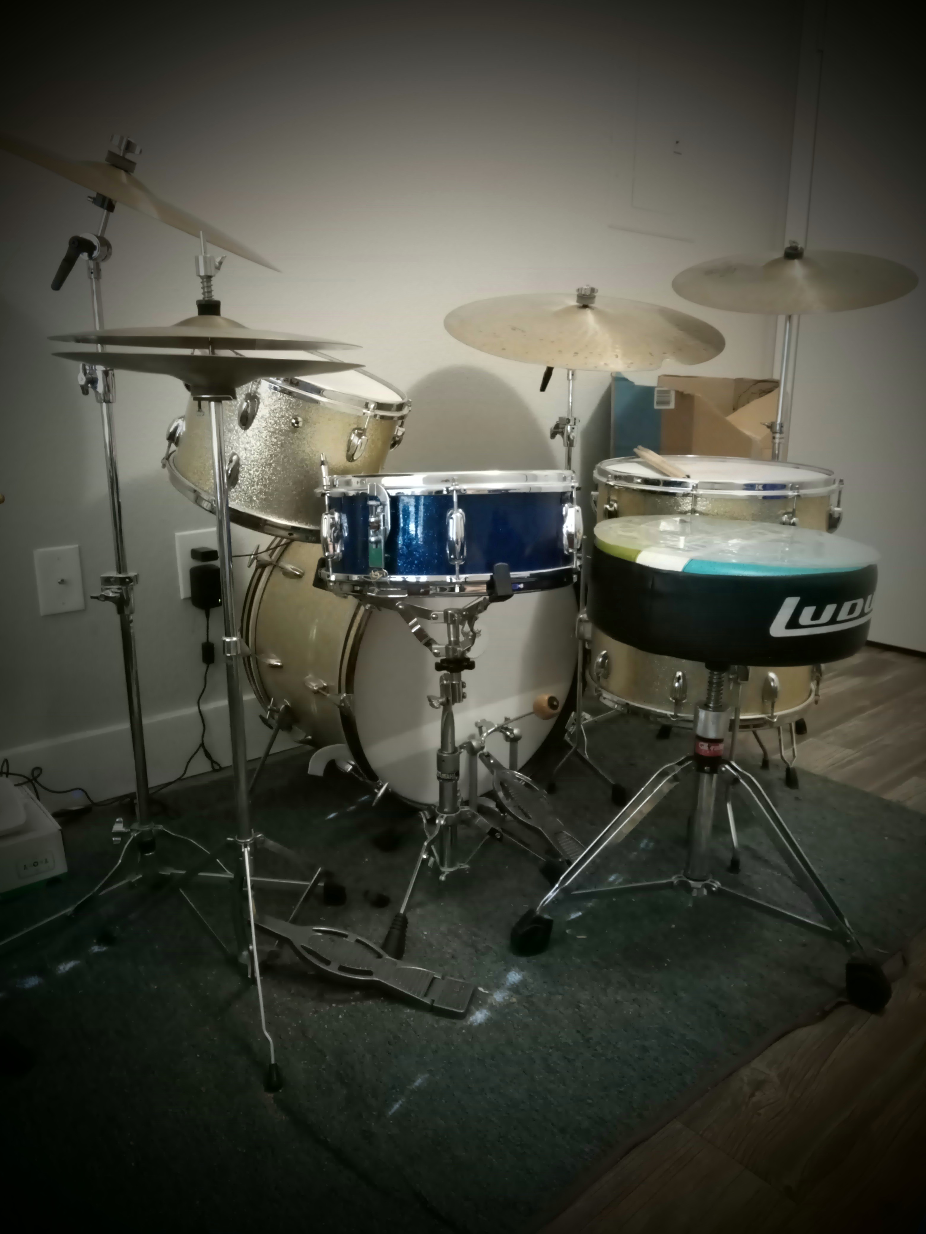 Here's my 1964 Slingerland kit in a silver sparkle finish, with a student model blue sparkle snare from the same year.