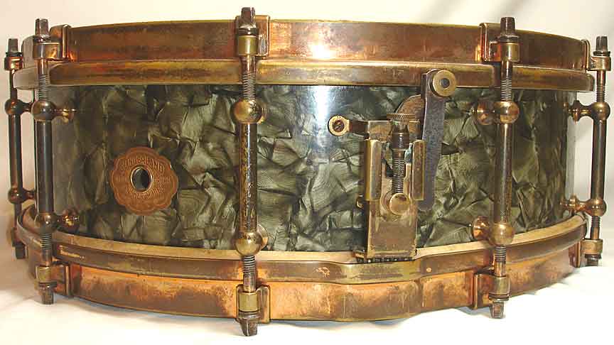 It is pretty much intact. Has the original calfskin heads still on it, though they are both torn, and has the original snares on the bottom in good shape. It also has a tone ring inside, which from what I have learned from this site, dates it to 1928-1930. I am pretty sure that this is a fairly rare drum. Just wondrin' what the heck I should do with this. Should I think about restoring it? It looks like the hardware is (or was) all laquered brass ar one time. I can only imagine how fantastic this thing must have looked when it was all shiny and new! I did work in a local music store for 13 years, and was their drum and guitar tech, so I do have quite a bit of experience in the instrument repair field. Of course the end goal is to sell it, but just wondrin' if it is worth spending some time and effort to restore it.