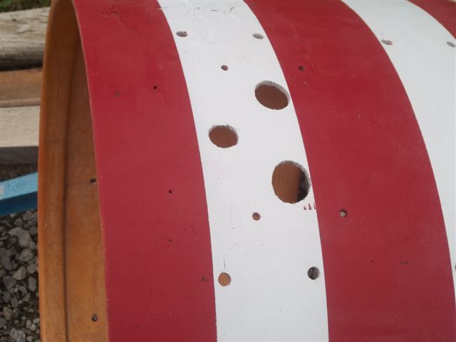 As you can see from the pics, it had an awful red and white paint job.I was able to fix that burn by cutting around it with a razor blade and removing the burnt inner ply, then just simply patching it in with new veneer. I did the same thing with the large holes from the incorrect tom mount.