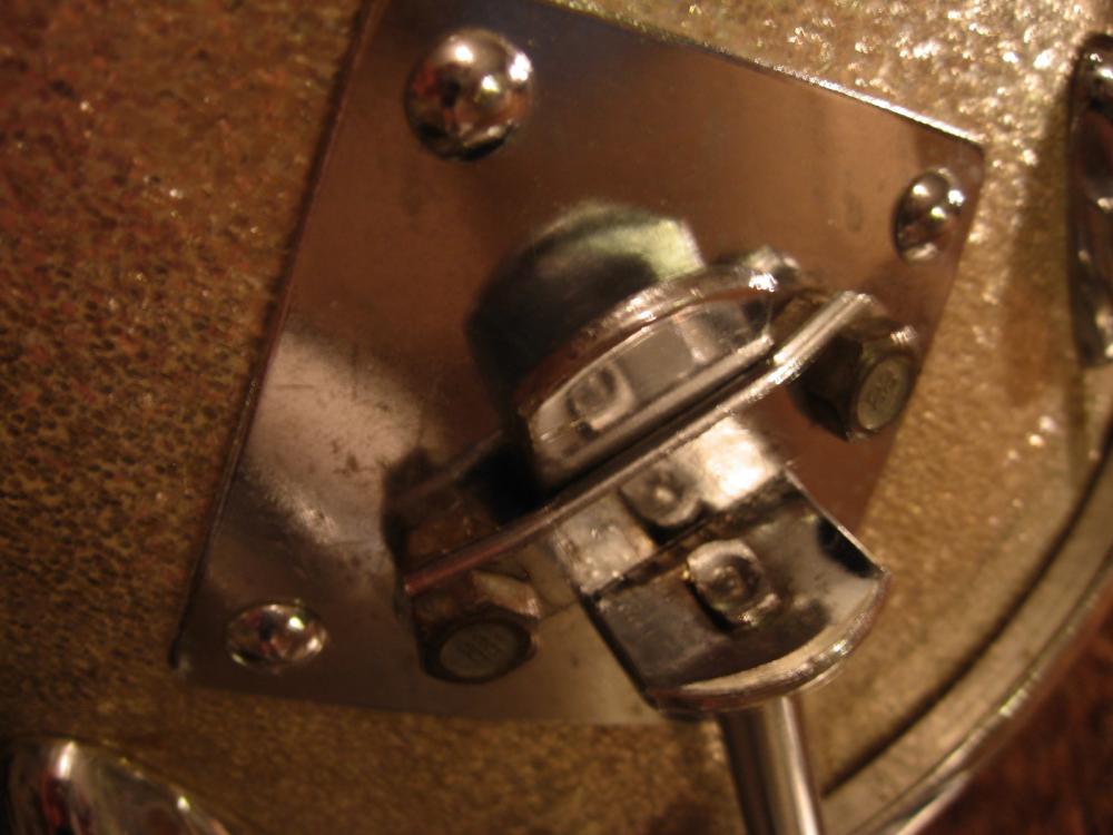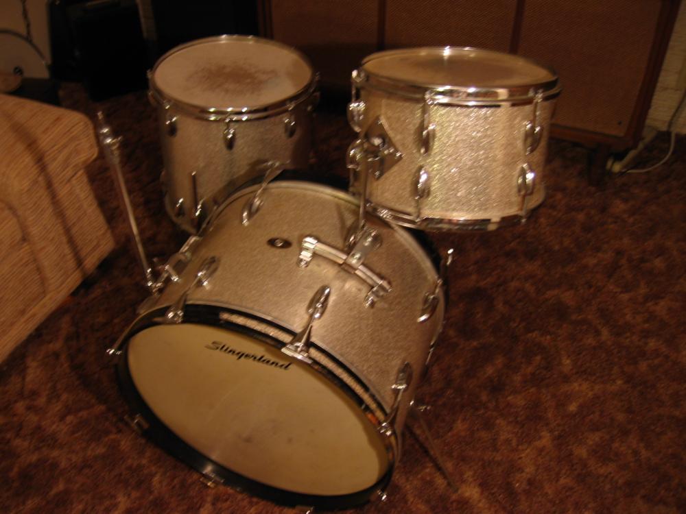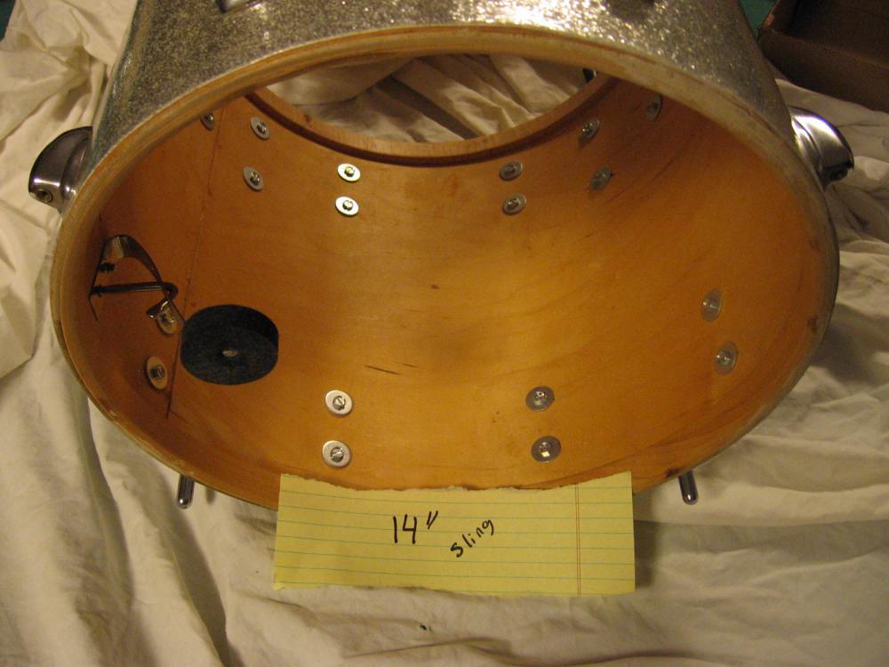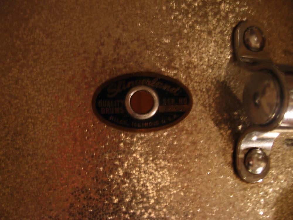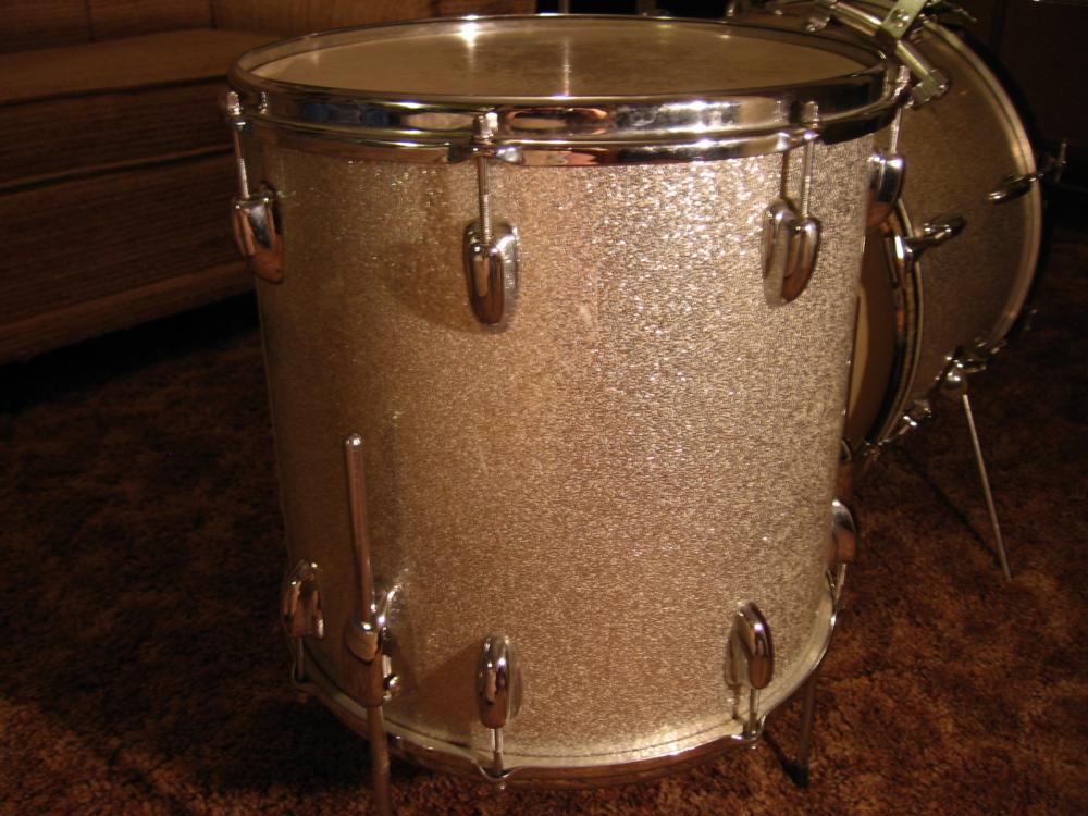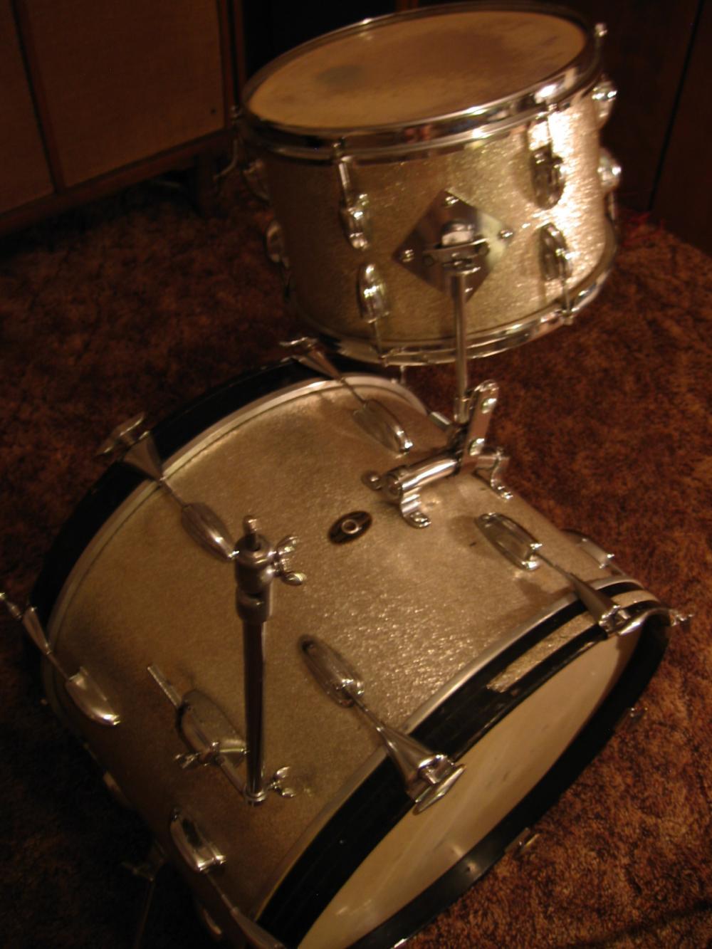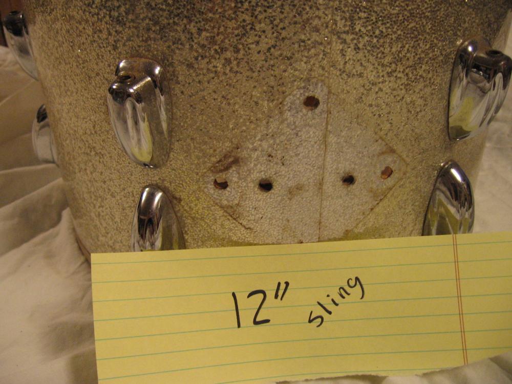 I picked this one up with hopes of having a nice true vintage kit to keep for a while, but a recent lawn mower failure is leaving me to prioritize a bit. The bass drum is the only one badged/grommeted. The tom and bass drum are labeled Jan 66, and the 14 floor is labeled Dec 65. The 12 has two extra holes where the diamond plate was repaired long ago. They would be hidden with a new one, but I know that drops the value a bit. The bass drum has one none original hoop, and 8 of the t's and claws are later year Slingerland. The floor is mostly untouched, and all of the muffler parts are there. there are a few spots on the chrome that aren't perfect, and the correct bass drum hoop is missing most of the inlay. I got these for a decent price, so if you would like to shoot me a PM I will entertain most offers. Sorry to not put up a price, but I did a little looking, and these have been all over the place for pricing recently. I prefer Paypal Only, lower 48 states only sales.