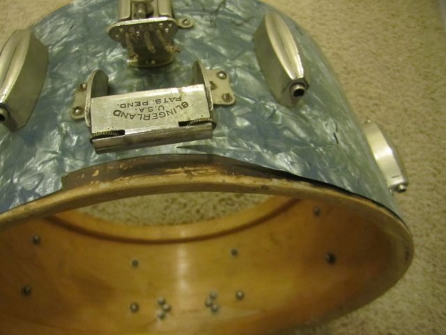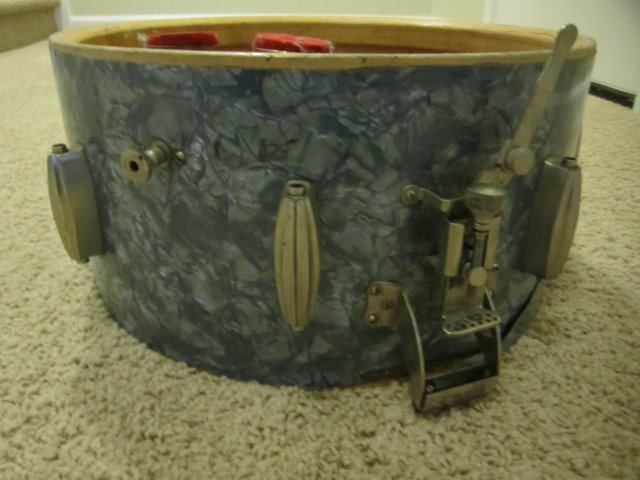 Hi all. This is my first post so I'm not exactly sure how to post with pictures but here goes. I was hoping to get some assistance from some Slingerland gurus in identifying a snare drum. I suspect it could be a 1930's or early 1940's Radio King. The drum is an odd size (actual size is 6 3/4" x 14") with 8 lugs and has some heft to it. The badge looks like it fits that time period and all the original shell parts seem to be there (lugs, strainer, tone control, etc). The batter hoop may not be original as it uses clips. The wrap is thin and peeling so I think that will need to be replaced. Hurts the value, I know, but I don't think it can be saved.