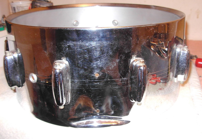 Hello everybody,need help in ID this snare drum,I recently purchase.It is 10 lug slingerland.6,5" depth.There is no snare mechanism on this snare,just two holes from each side of snare,I think that they are not all original.Magnet dont stick to this shell.I am posting some pictures so you can see what I cant explain due to my poor english.Serial number is 413399.Can you tell me model and year and what the original snare stainer look like?