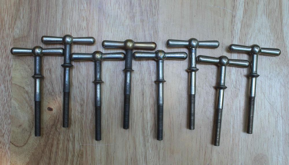 These are thick diameter rods for timpani, and will NOT work with tom lugs. Three have an "L" stamp, so I'm assuming they're Ludwig. I'm not sure of the exact age, but they're from sometime in the early 20th century. Sold in "as is" condition.