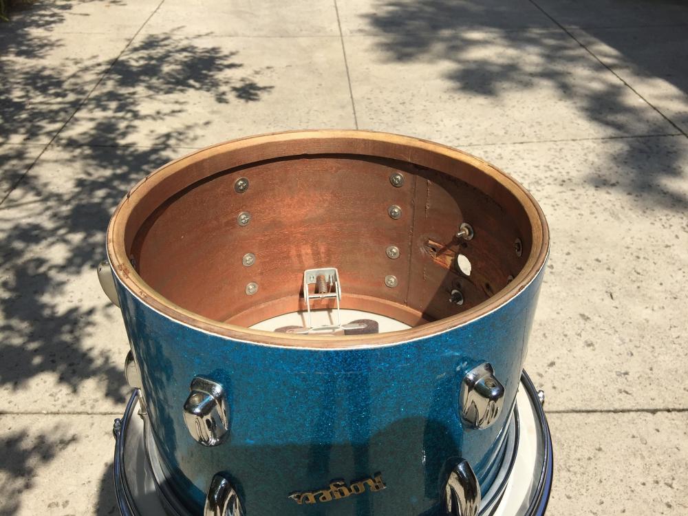 There is no grommet or badge on the drum, and I cannot find a date stamp inside of the shell. The drum was disguised as a Rogers, so a Rogers badge was installed (I have removed it) and a Swivomatic mount was drilled over the original diamond plate mount. Edges are in good shape and the interior is a dark brown. The wrap has scratches and is lifting at the seam a bit. The chrome on the lugs are all in good shape minus a few in which the chrome has peeled off.