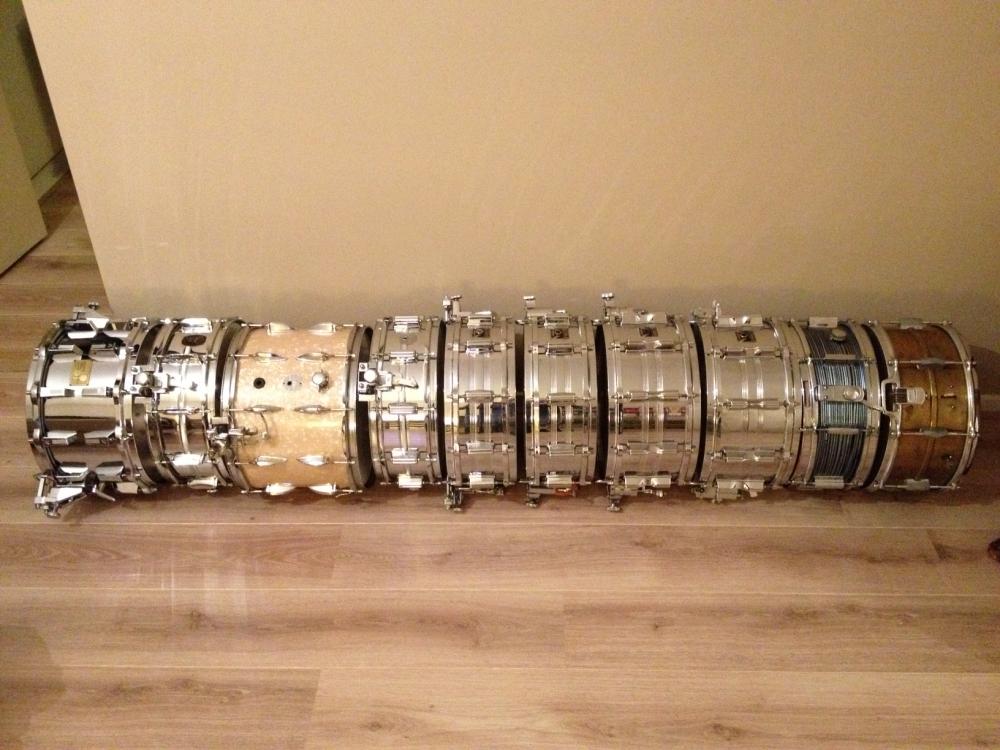 Sonor HLD 588, Star Royal King Beat, Star Imperial King Beat parade drum, Star Royal King Beat (different badge and lugs), Tama Imperialstar King Beat (2 5x14 and 1 6.5x14 all from different periods), Tama Impialstar Mastercraft, Tempro snare and Premier Dominion Major.