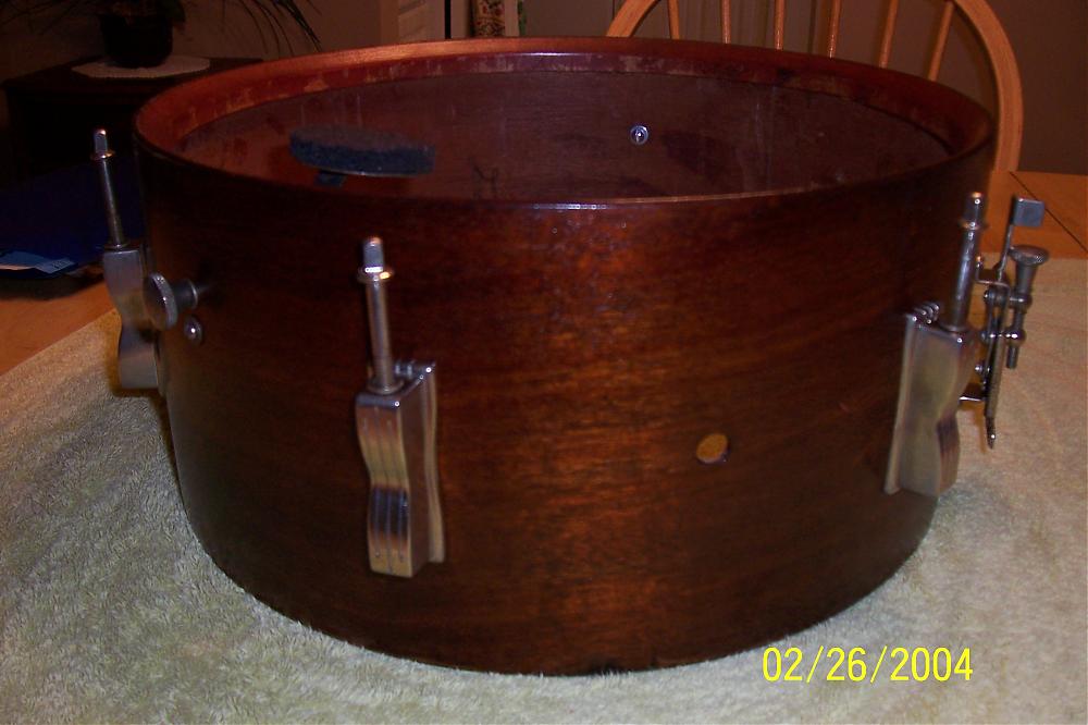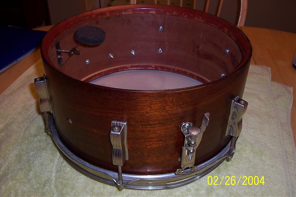 hello all, here is where i'm at on my 1959 6 lug lugwig. Please keep in mind this is my first attemt , and am not going by any rules. When the drum came to me it looked like some one brushed poly over it, so I stripped it to bare mahogany and rubbed 5 coats of tung oil on it. cleaned the hardware best I could, and added new nut & bolts. Still need six more tension rods (2 3/4" over all length if any body has for sale?) I also would like to throw a few questions out in hopes for some advise. Being a 59" what should I look for...