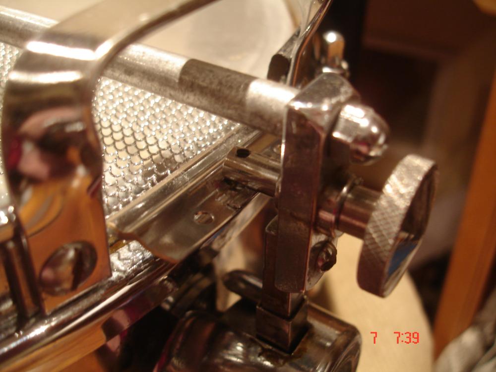 Okay, my machinist buddy has reproduced the missing parts that Kevin and I were needing. The tension knob ( I guess that what you call it) was an exact match except for the knurling on the edge, that's because I wanted it to match my tone control knob. I cant thank Kevin enough for sending me his parts to use as a model for my parts. I did have my buddy make Kevin a rod that goes between the strainer and butt for his drum , it was a perfect match to mine as well. Now both Kevin and I are faced with the task of finding snare wires to fit this mechanism. Any help would be appreciated, I still think there must be a way to cut down a new set of wires or someone must make custom snare wires somewhere in this country.