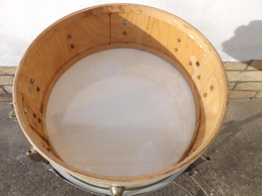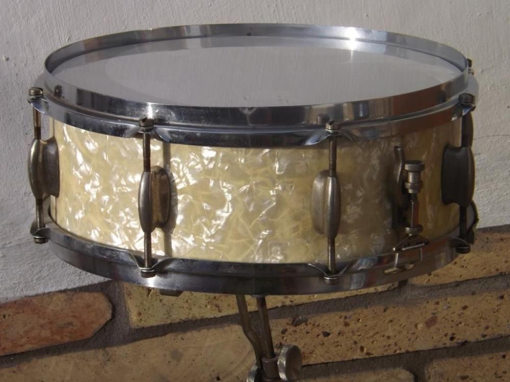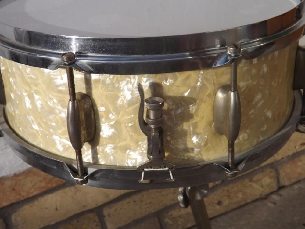 The badge footprint from a SONOR snare of early fifties would leave three small tack holes. Area drum shops also would build on SONOR designs.