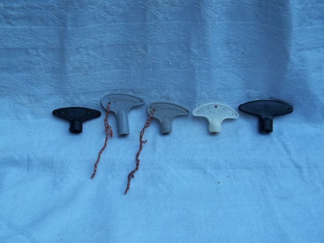 Here is a group of tempered steel/ plastic encased German drum keys made from 1960 onwards. Tromsa, Trixon( with red and white loop cord), Trixon( with red and white loop cord), Deri/Rimmel, Sonor. The construction of these keys( especially , the shorter Trixon and the Rimmel) are so similar, that it would seem that they were all made by one manufacturer . It also seems so, for the earlier cast keys,that these replaced----in that case possibly, the Rimmel foundry.