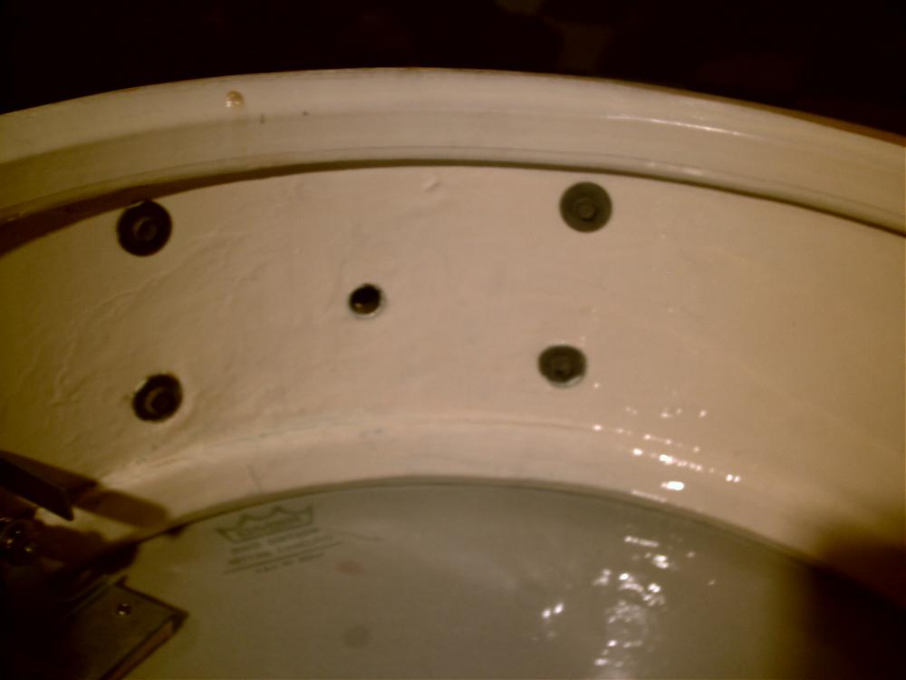In the second pic you can see where a glob of glue has dripped towards the bearing edge on the reso side of the drum. I am guessing the glue is from the re-rings but what is strange is the glue is not painted but laying on top of the paint.