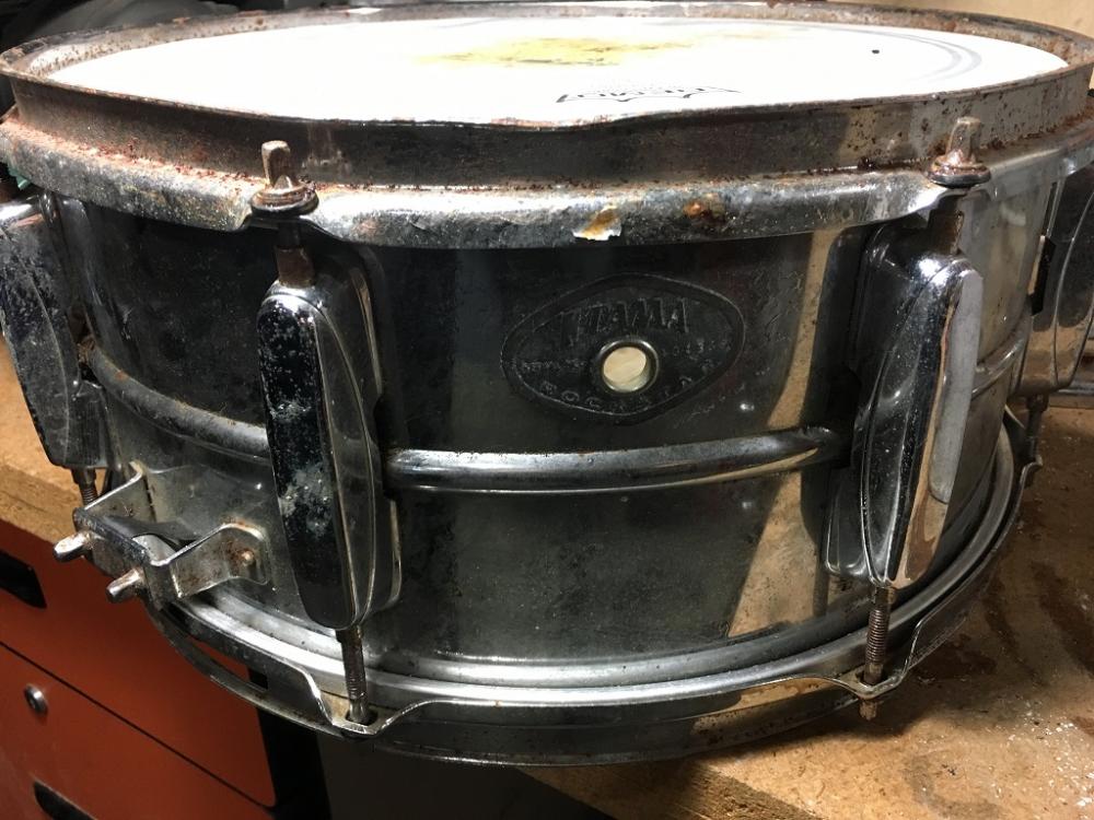 It came with an old 6.5x14 Tama Rockstar chrome snare (pictured) that's mostly junk (rusted hoops, mismatched broken lugs), but the shell looks salvageable. I plan to clean it up and get some replacement parts, but I'm having trouble finding lugs with the correct hole spacing. When I measured, the spacing was just shy of 2 inches, and I found a Tama diagram that has the spacing at 48.5mm, which appears correct for this drum.